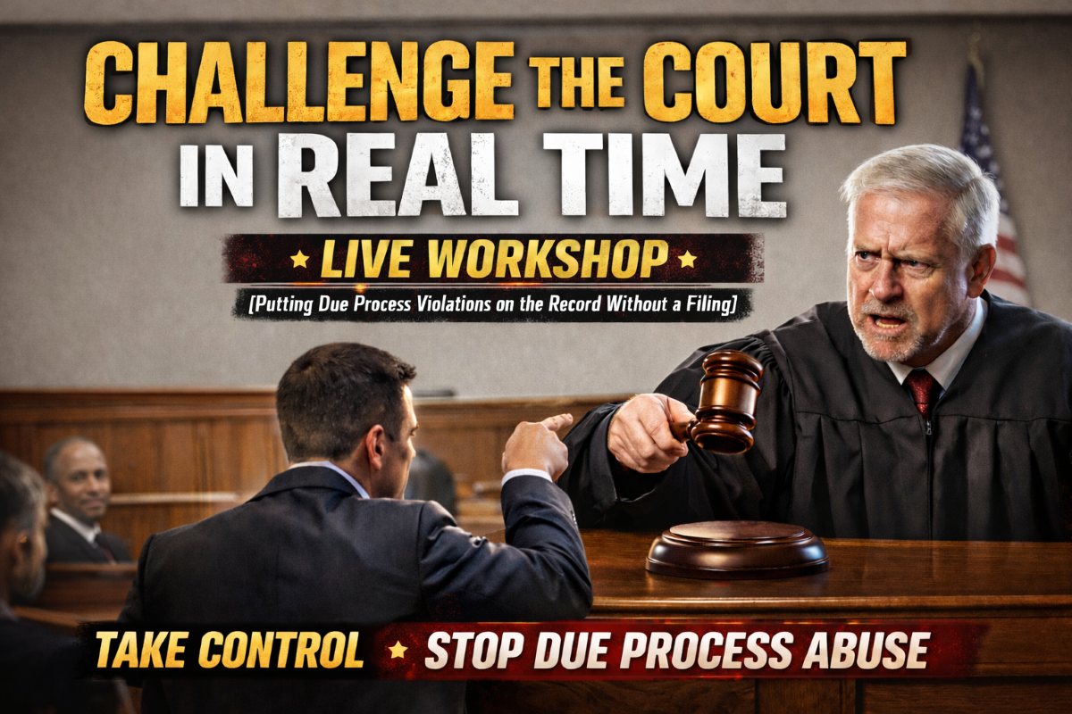This Live Workshop teaches you how to step in before the hearing starts, establish your position on the record, and force the court to respond, rather than moving forward without you. Learn how to control the process in real time, stop getting cut off, and prevent the court from defining your position before you do before you speak.